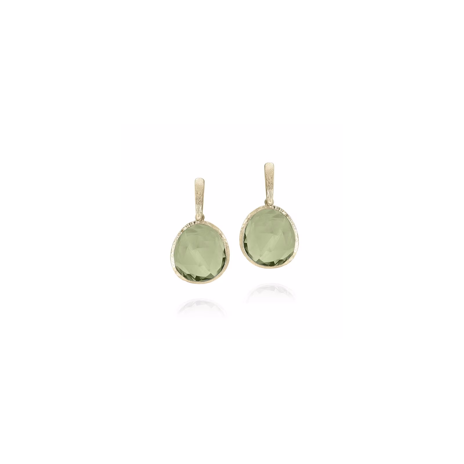 Pendientes de presión de la colección Shade de Jorge Revilla, con un diseño vertical del que cuelga una piedra natural de amatista verde. Fabricados en plata de ley 925 con baño de oro de 18 quilates, combinan movimiento y ligereza con un tono suave y luminoso.