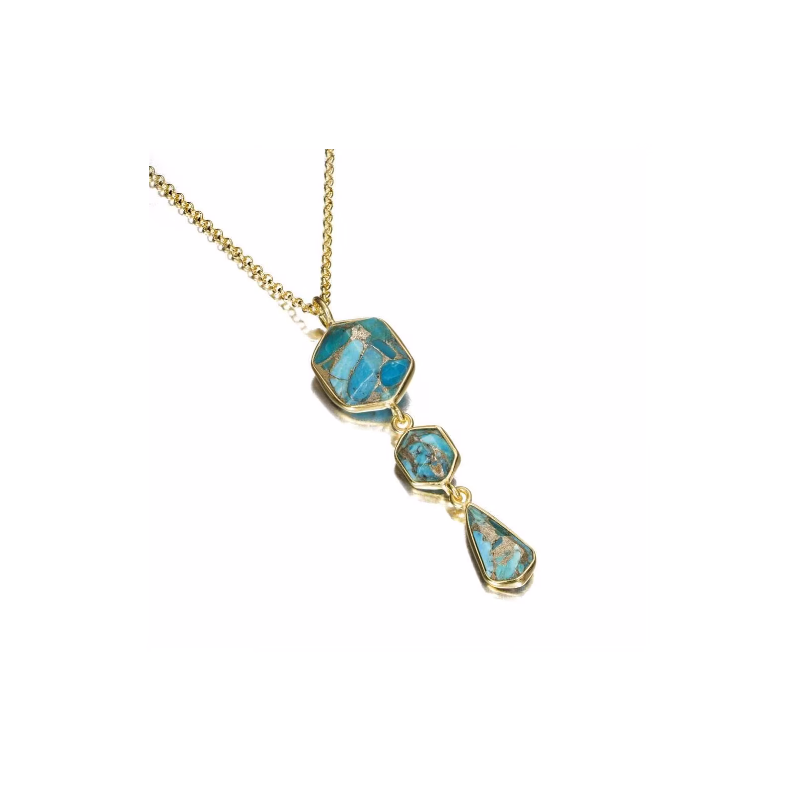 Colgante con tres piedras naturales Turquesa facetadas geométricamente, en plata de ley 925 con baño de oro 18k. Su diseño aporta color, armonía y sofisticación, ideal para completar cualquier look. La cadena se vende por separado.