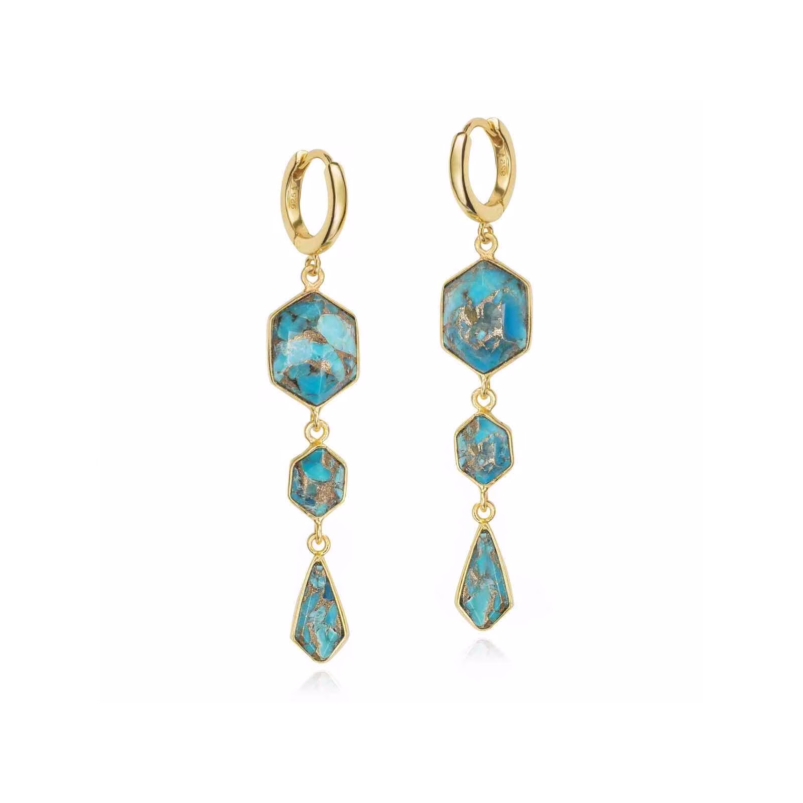 Pendientes largos de aro con tres piedras naturales Turquesa con facetado geométrico, en plata de ley 925 con baño de oro 18k. Su diseño combina elegancia, color y sofisticación, ideal para aportar un toque moderno y llamativo a cualquier look.