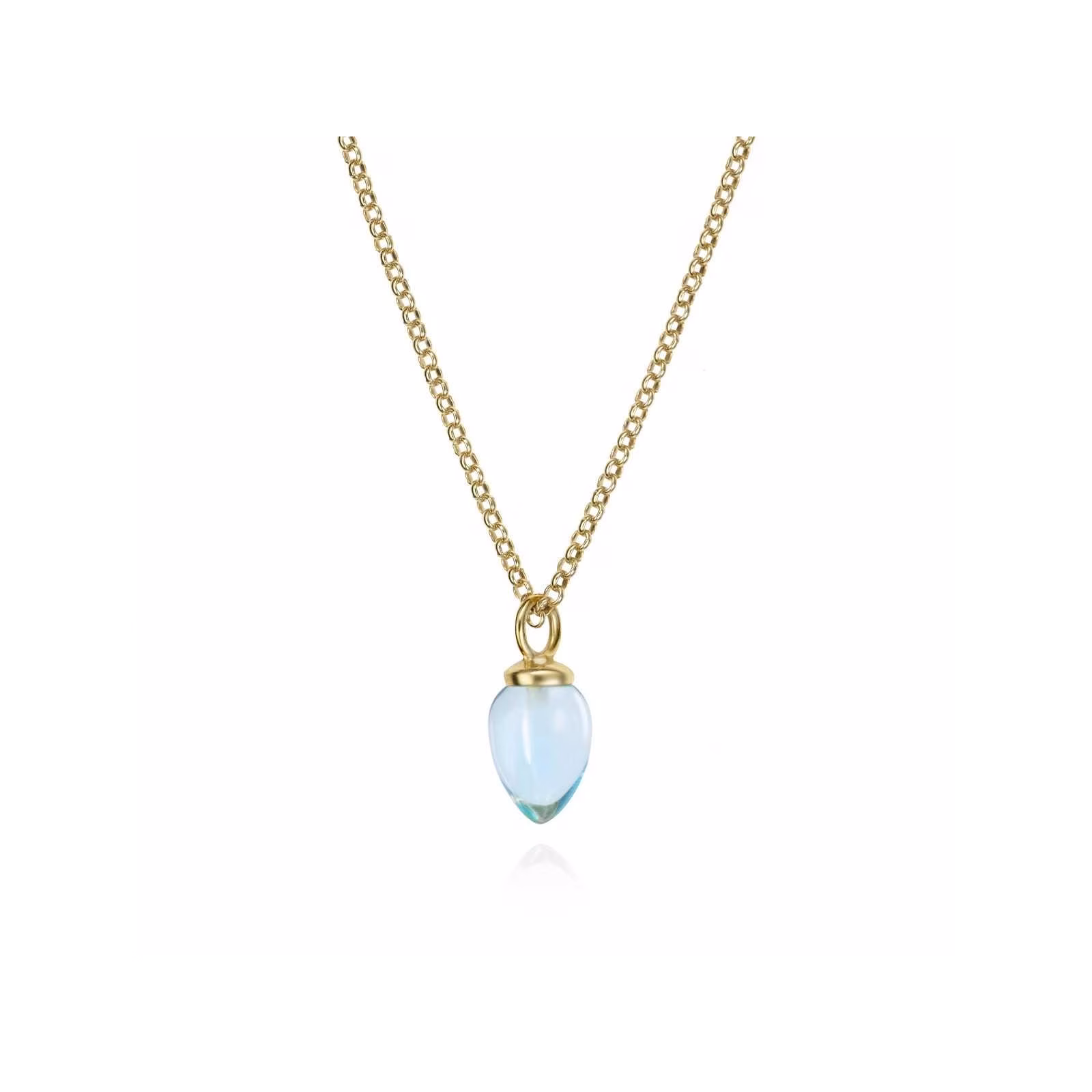 Este colgante destaca por su diseño de talla única de piedra natural Topacio Azul en forma de lágrima o péndulo, haciendo referencia al nombre de la colección. Ideal para combinar con cualquier look y aportar un toque de color y sofisticación.