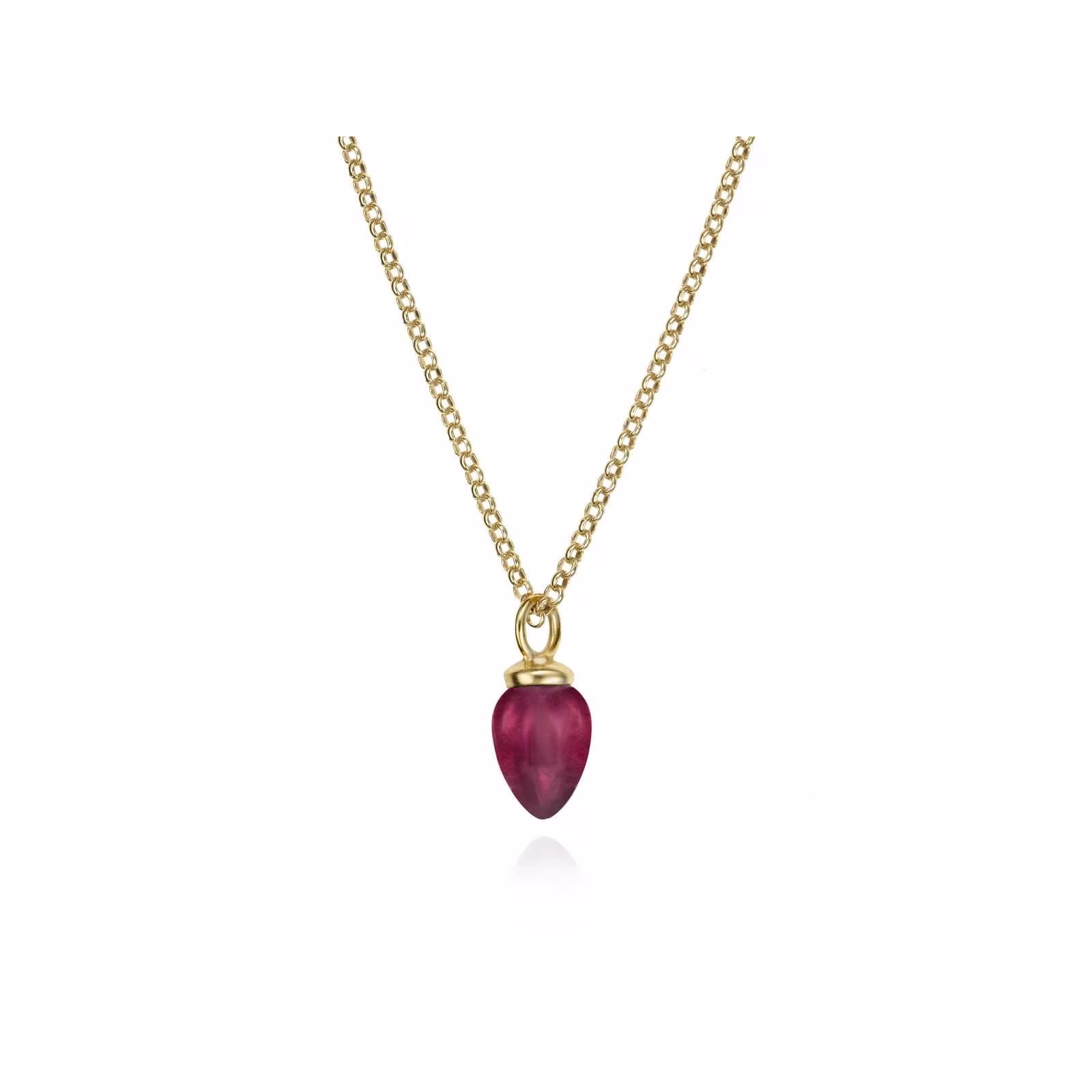 Este colgante destaca por su diseño de talla única de piedra natural Rubí en forma de lágrima o péndulo, haciendo referencia al nombre de la colección. Ideal para aportar un toque de color y sofisticación a cualquier look.
