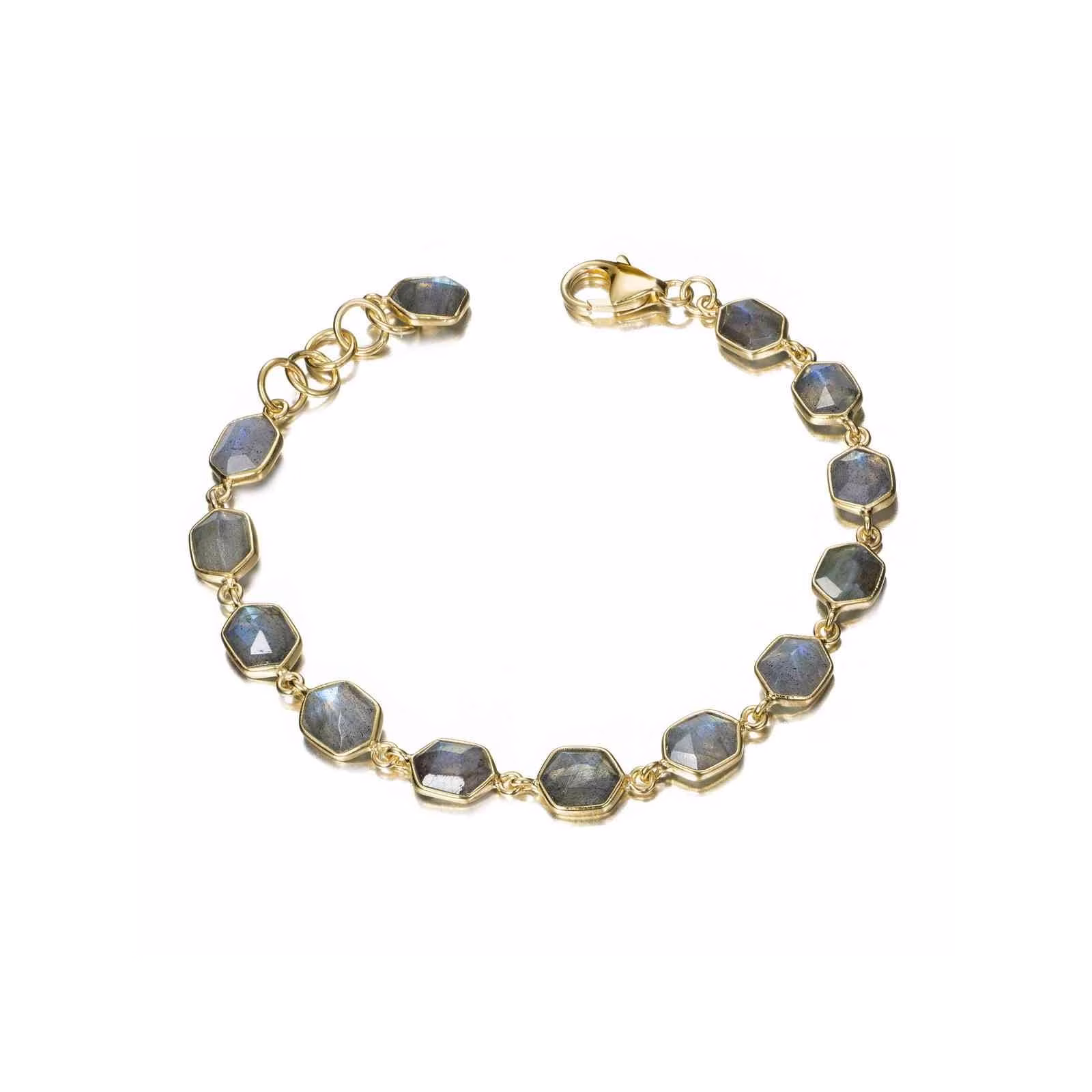 Pulsera con eslabones de piedras naturales Labradorita facetadas en forma hexagonal, en plata de ley 925 con baño de oro 18k. Su diseño aporta color, armonía y sofisticación, ideal para completar cualquier look.