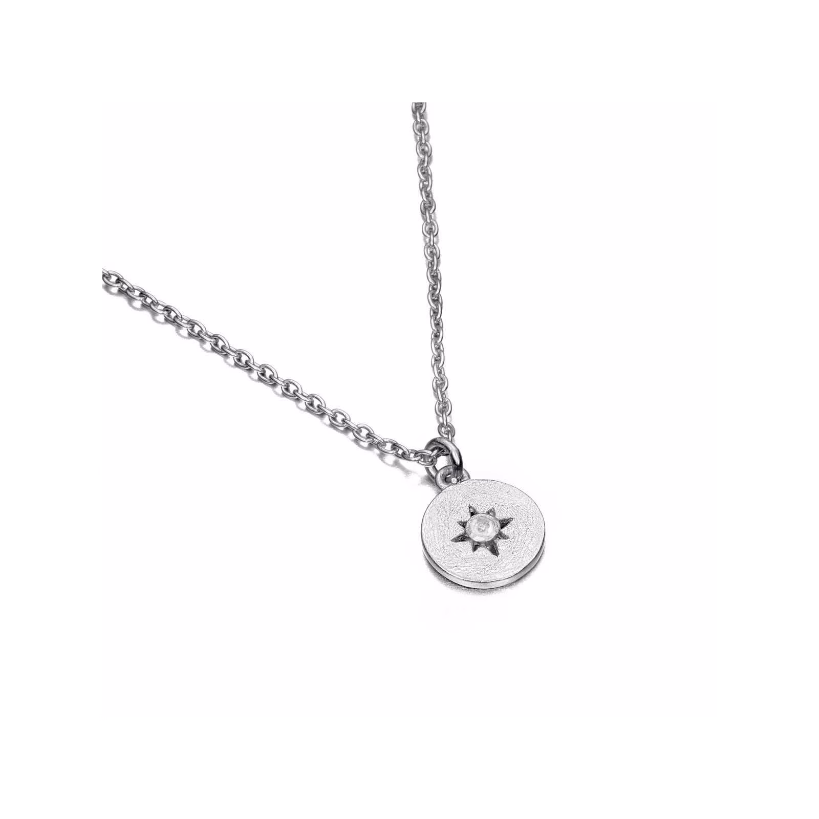 Collar de plata de ley con un pequeño charm circular que alberga una fina estrellita junto a una piedra natural de espectrolita, brillante y llena de matices. Forma parte de la colección Shine de Jorge Revilla, inspirada en el brillo natural que aporta un toque de elegancia atemporal. La cadena se vende junto con el charm para completar el conjunto.