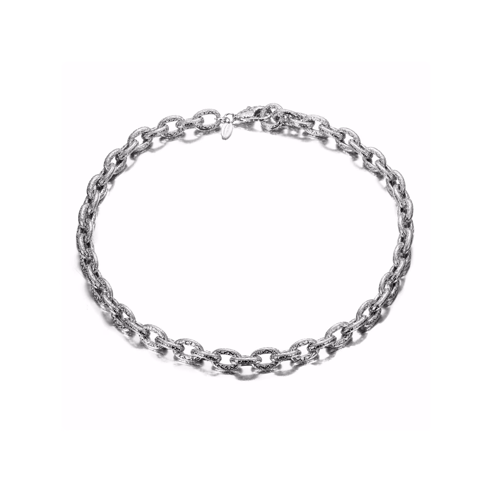 Consta de 49 eslabones ovalados en plata de ley 925, cada uno delicadamente ornamentado con motivos florales, evocando la belleza y el refinamiento de la joyería clásica.