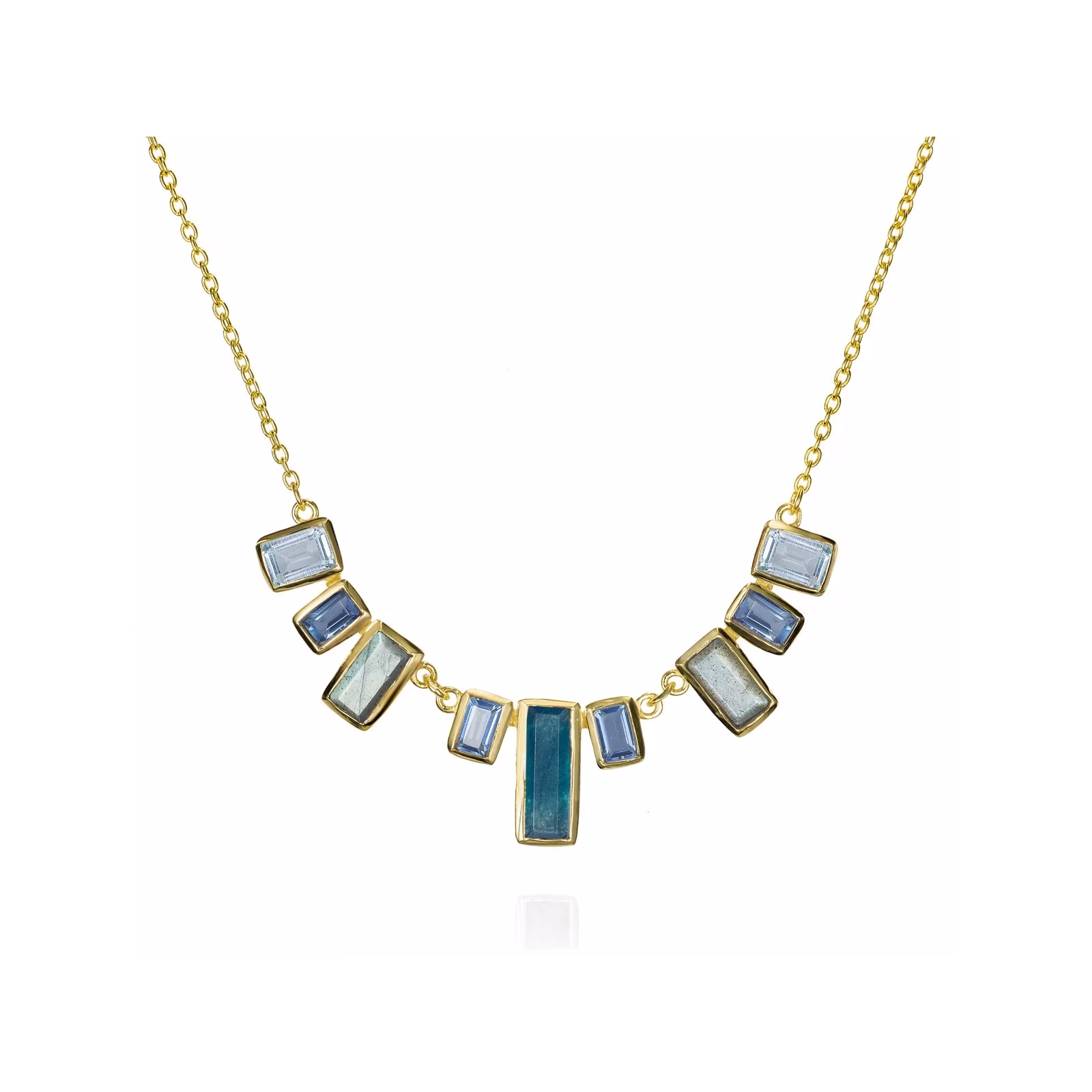 El Collar skyline multicolor de la colección Empire de Jorge Revilla combina elegancia y un toque lúdico de color. Fabricado en plata de ley bañada en oro 18k, cuenta con un juego de 9 piedras naturales en forma rectangular de diferentes tamaños, incluyendo topacio, iolita, labradorita y apatita, que crean un efecto visual único similar a un “skyline” lleno de vida.