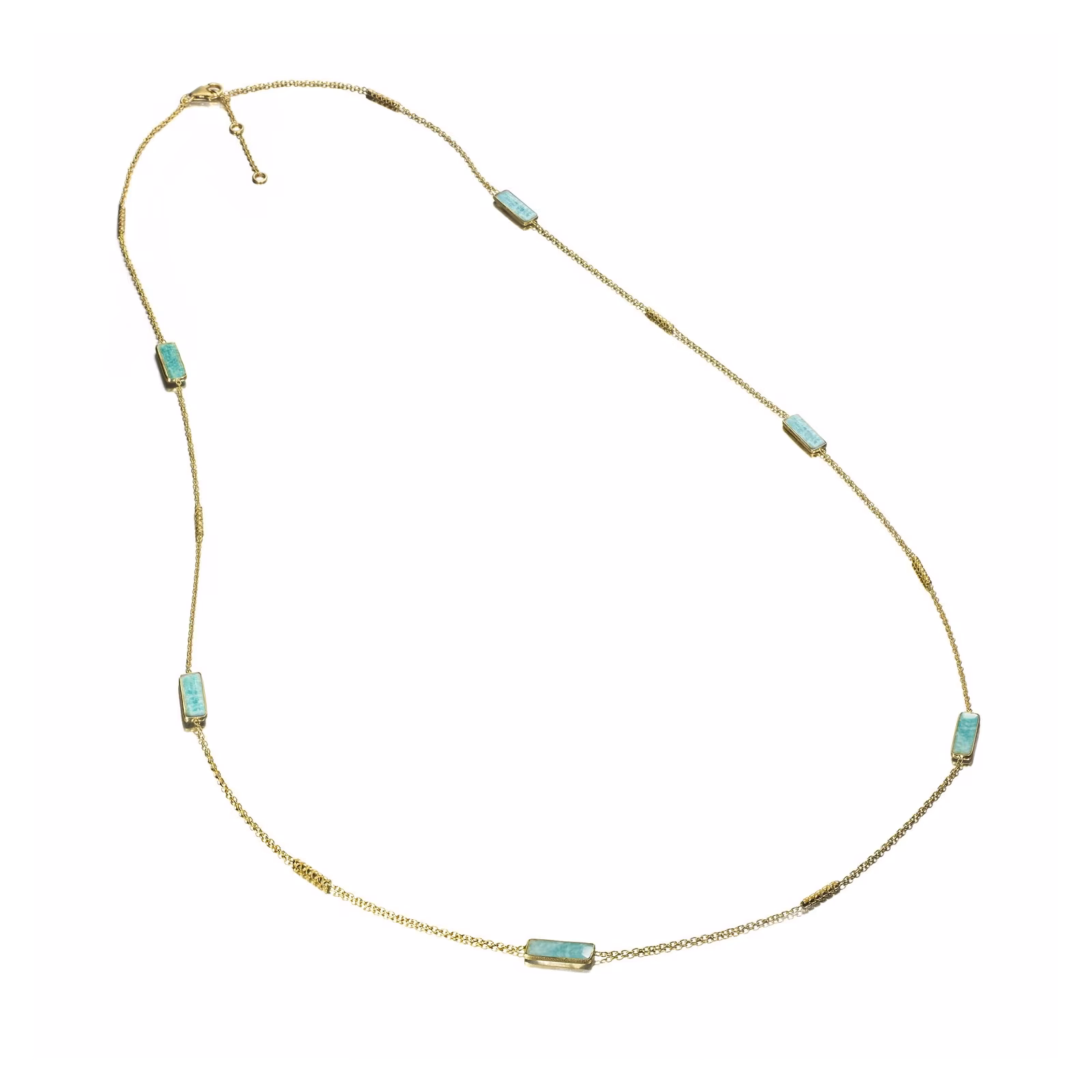 Luce elegante con el Collar largo con amazonita de la colección Empire de Jorge Revilla. Confeccionado en plata de ley bañada en oro 18k, incorpora una piedra natural de amazonita en forma rectangular, que aporta frescura y serenidad a tu estilo.