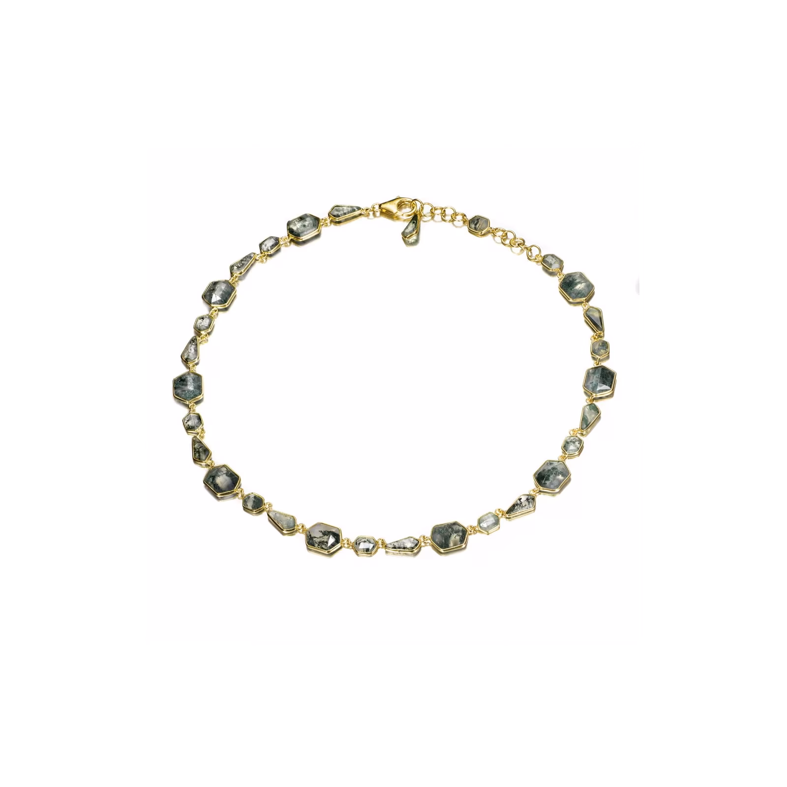 Collar con eslabones de piedras naturales Ágata Musgo facetadas geométricamente, en plata de ley 925 con baño de oro 18k. Su diseño aporta color, armonía y sofisticación, ideal para completar cualquier look. Inspirado en la armonía de las formas geométricas y la energía de las piedras naturales, Jorge Revilla transforma líneas y ángulos en joyas contemporáneas que combinan fuerza y equilibrio.
