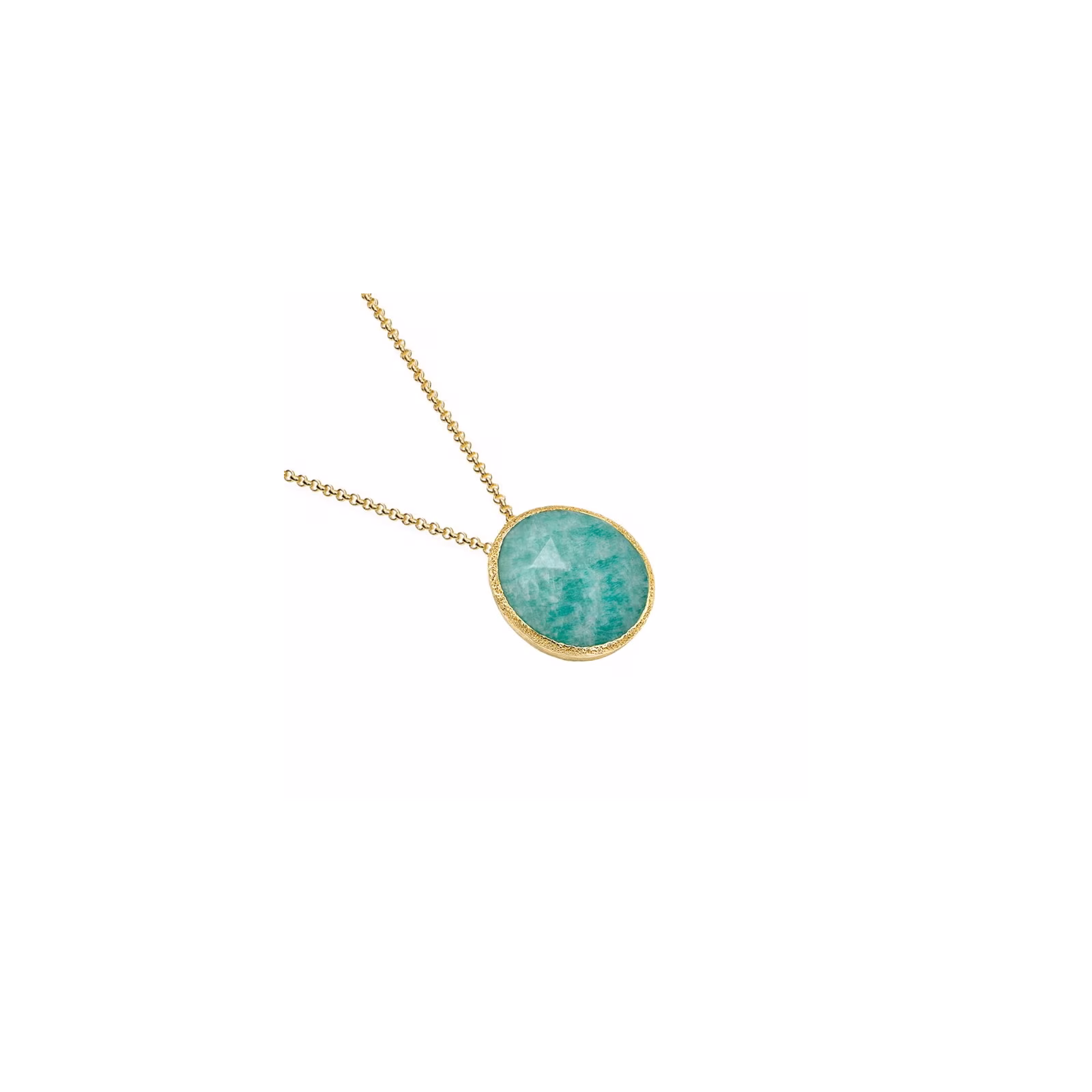 Colgante de la colección Shade de Jorge Revilla con piedra natural de amazonita de 20 mm y enganche oculto detrás de la piedra para un acabado moderno. Fabricado en plata de ley 925 con baño de oro 18k.