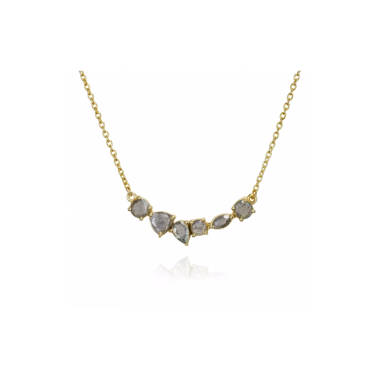 Consta de seis piedras naturales de Labradorita en diferentes formas geométricas, engastadas en plata de ley 925 con baño de oro 18K, creando un efecto armonioso que combina a la perfección con los pendientes de presión y trepadores.