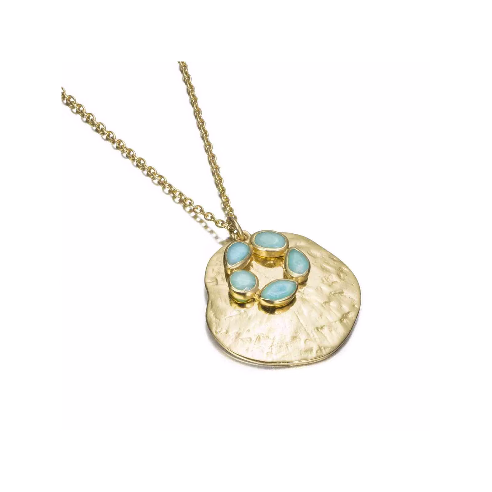 Este collar de la colección Morning de Jorge Revilla presenta un diseño floral con colgante de forma irregular que incluye amazonita natural, conocida por transmitir calma y elegancia a través de sus tonos suaves.