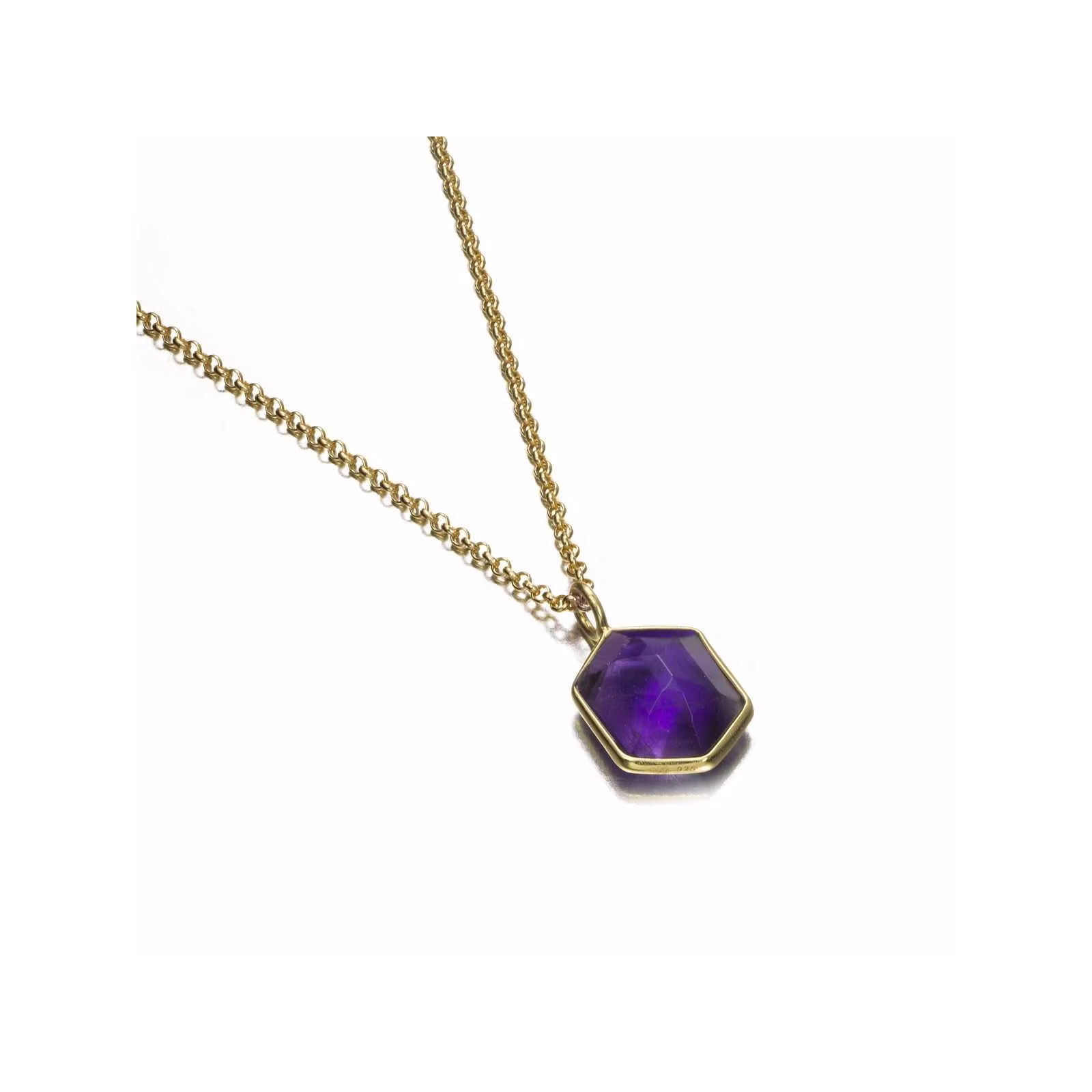 Colgante con piedra natural Amatista facetada en forma hexagonal, en plata de ley 925 con baño de oro 18k. Su diseño aporta elegancia, color y sofisticación, ideal para combinar con cualquier look. La cadena se vende por separado.