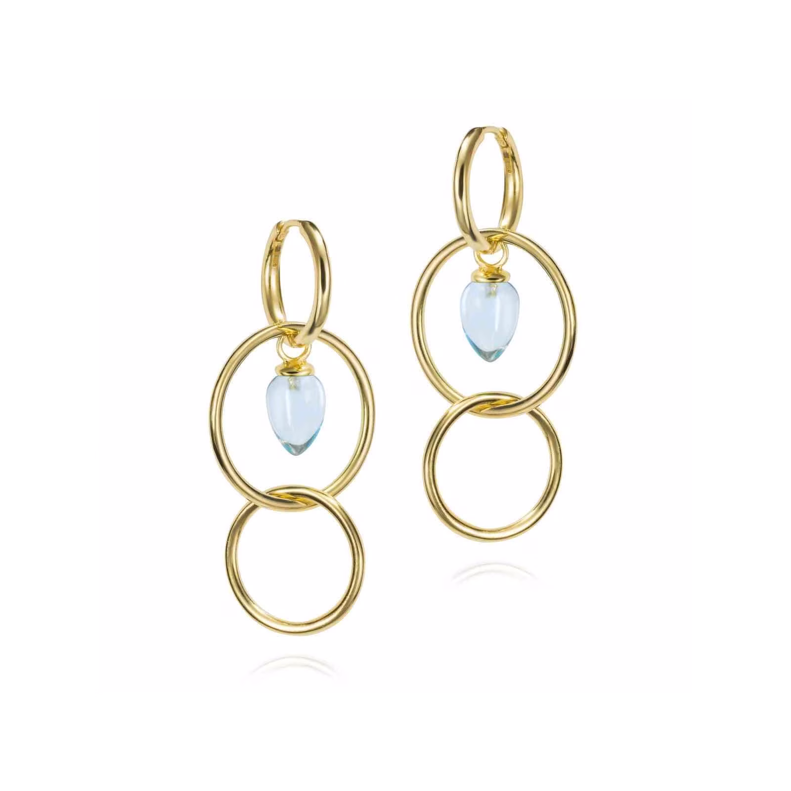 Con un diseño lleno de dinamismo, estos pendientes combinan dos aros móviles que se pueden colocar en distintas posiciones, junto con una piedra natural de Topacio Azul en talla única. Una pieza luminosa que aporta elegancia y serenidad a cada look.