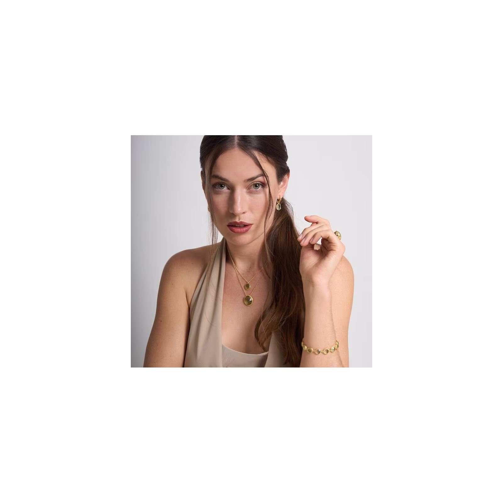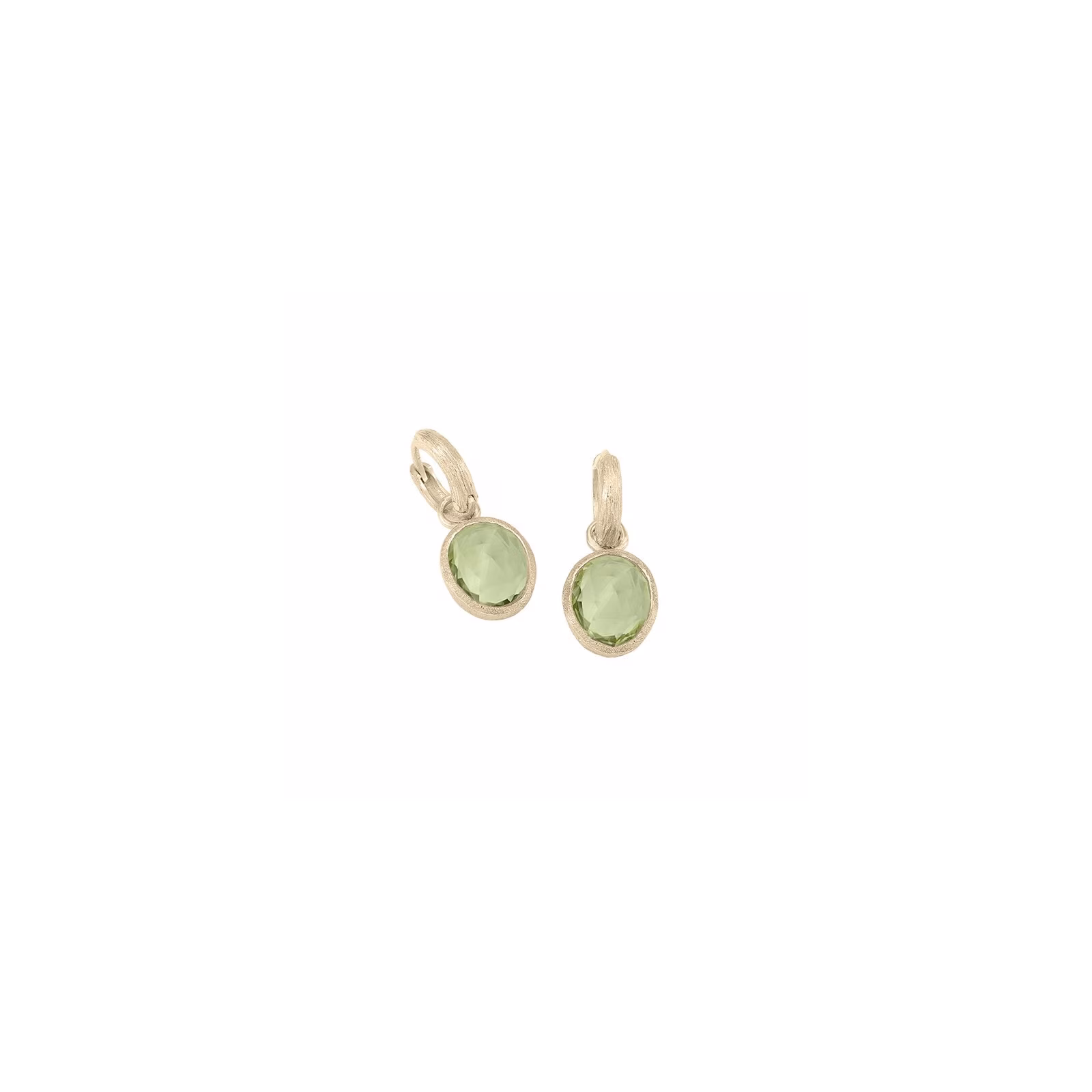 Pendientes aro pequeños de la colección Shade de Jorge Revilla, con una piedra natural de amatista verde colgando del aro. Realizados en plata de ley 925 con baño de oro 18K, combinan sencillez y elegancia para un estilo clásico.
