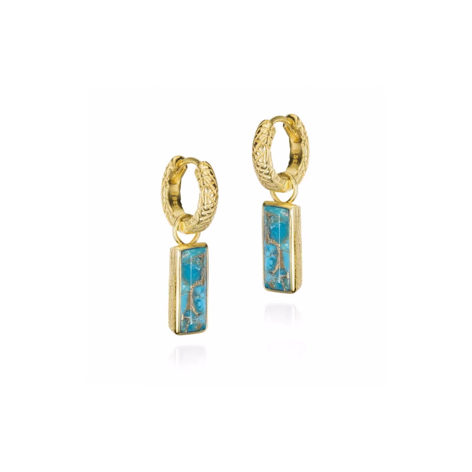 Los Pendientes de aro con turquesa de la colección Empire de Jorge Revilla combinan color y sofisticación. Elaborados en plata de ley bañada en oro 18k, cuentan con un pequeño aro del que cuelga una piedra natural de turquesa en forma rectangular, aportando un toque vibrante y elegante a cualquier conjunto.