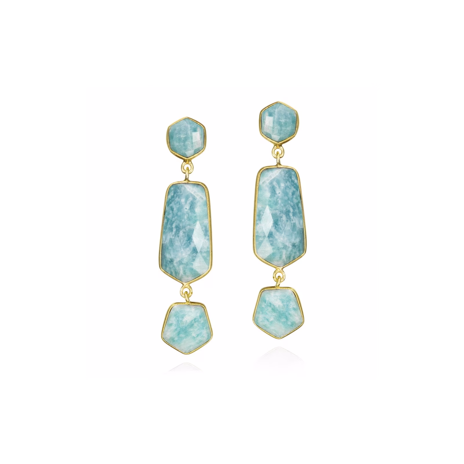 Pendientes largos con Amazonita diseñados en tallas geométricas, en plata de ley 925 con baño de oro 18k. Cada piedra ha sido cuidadosamente seleccionada y tallada a mano, creando un juego de luces que aporta elegancia y sofisticación a cualquier look.