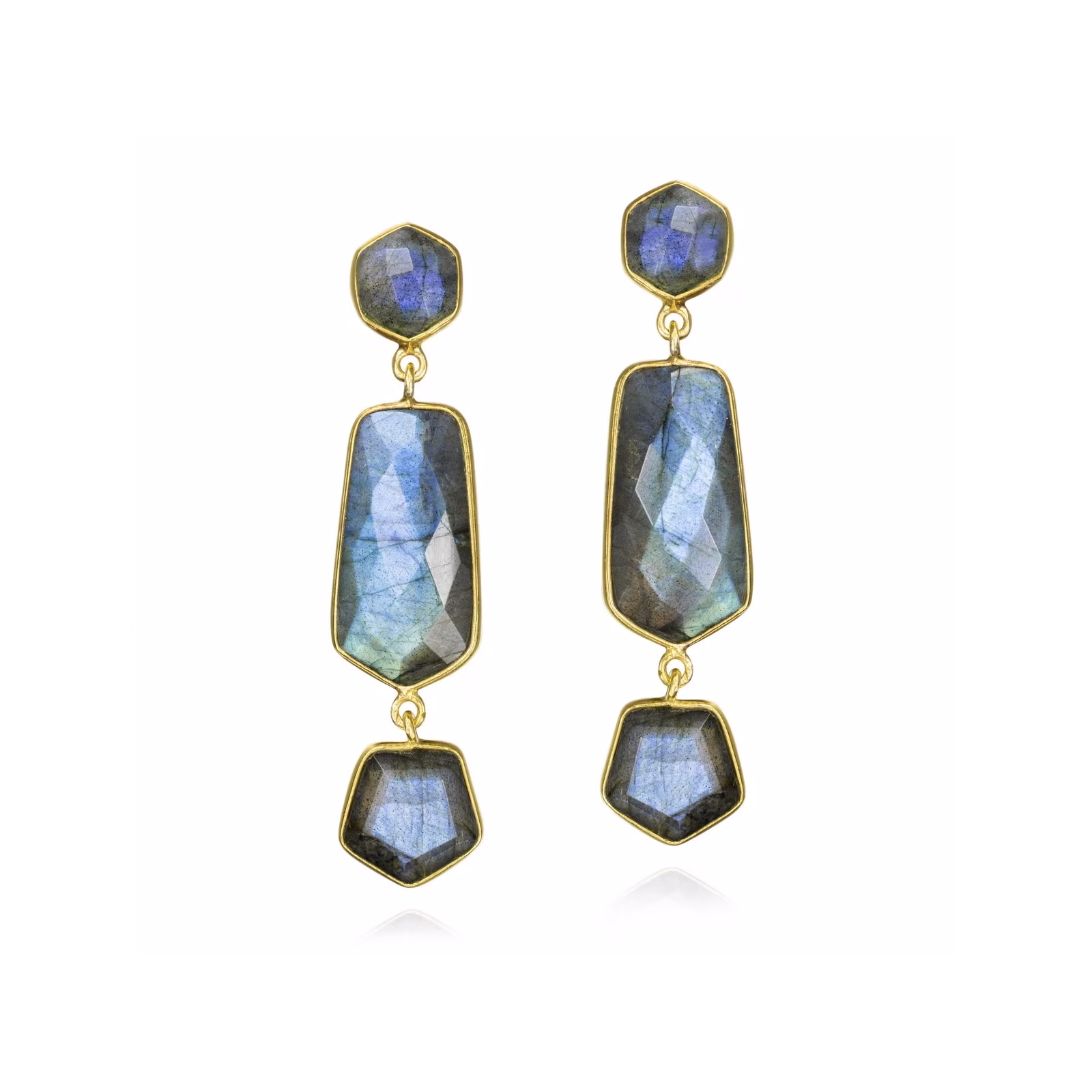 Pendientes largos con Labradorita geométrica en baño de oro 18k