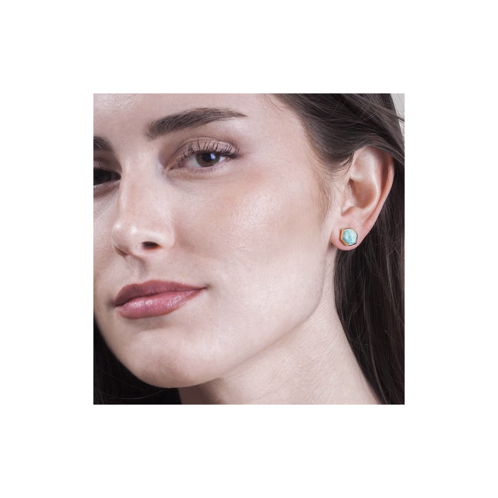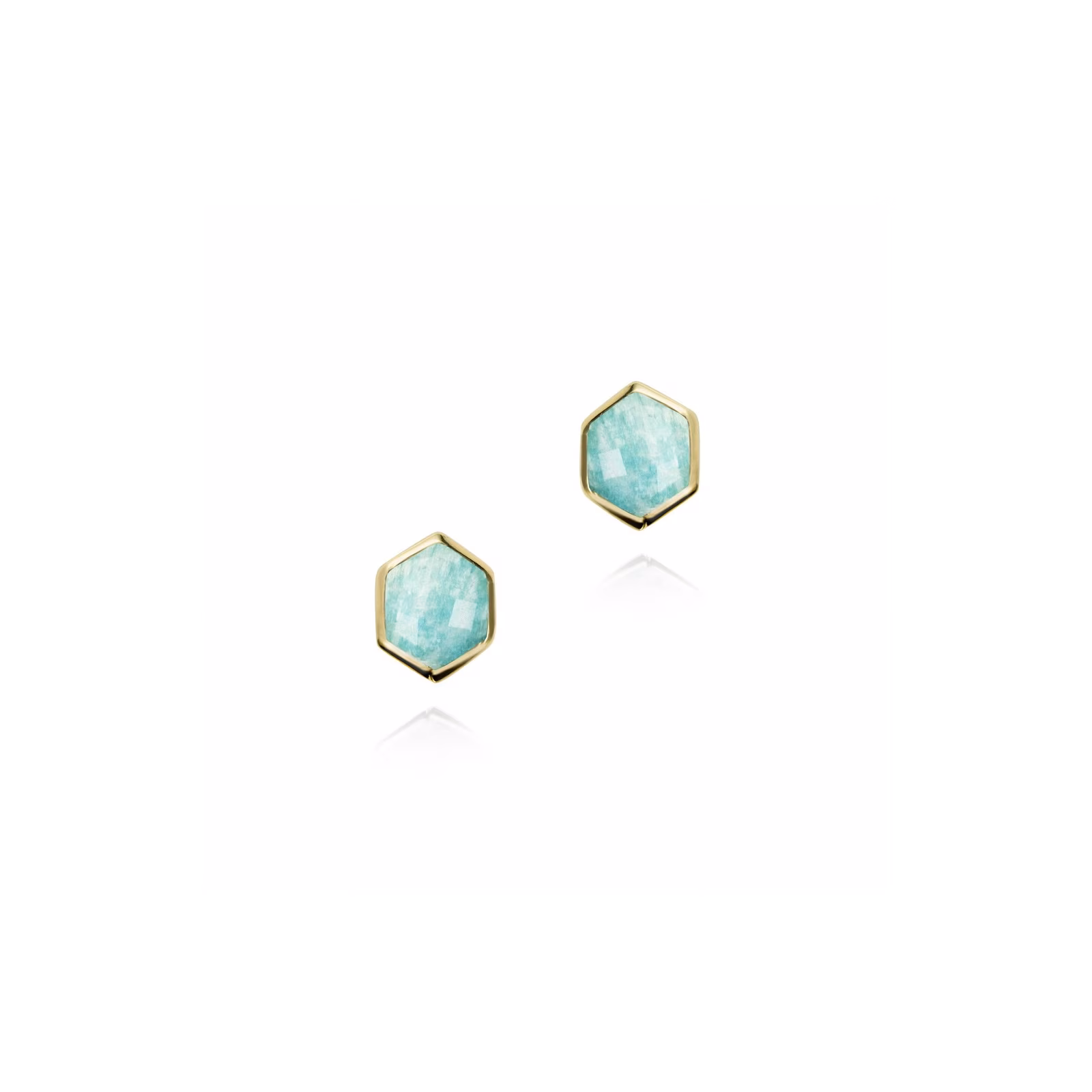 Pendientes con Amazonita de talla única hexagonal, en plata de ley 925 con baño de oro 18k. Cada piedra, cuidadosamente elegida y trabajada a mano, captura la luz para aportar elegancia a tu estilo.