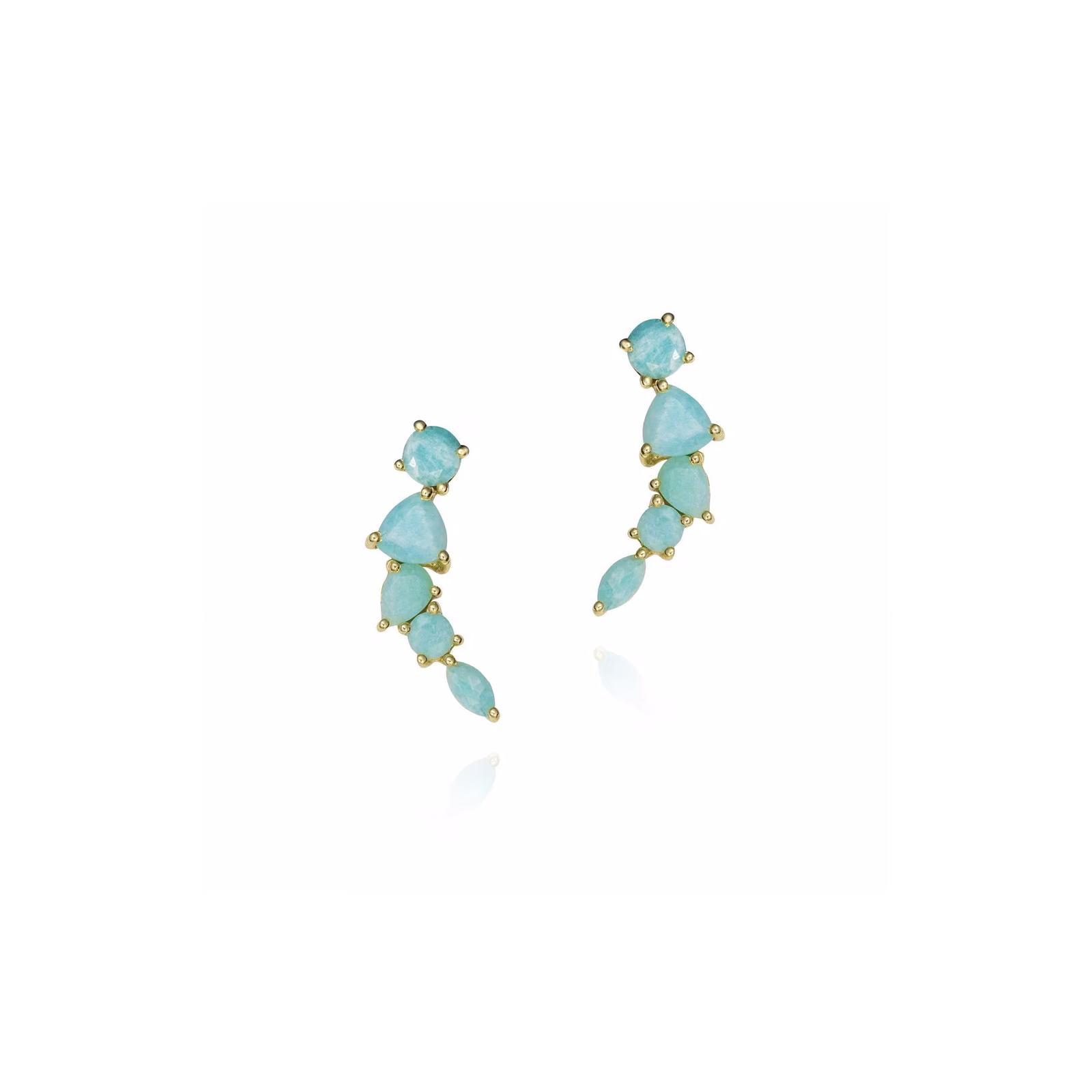 Cada pendiente está compuesto por cinco piedras naturales de Amazonita en diferentes formas, cuidadosamente engastadas en plata de ley 925 con baño de oro 18K, creando un efecto armonioso y colorido que acompaña la curva de la oreja.