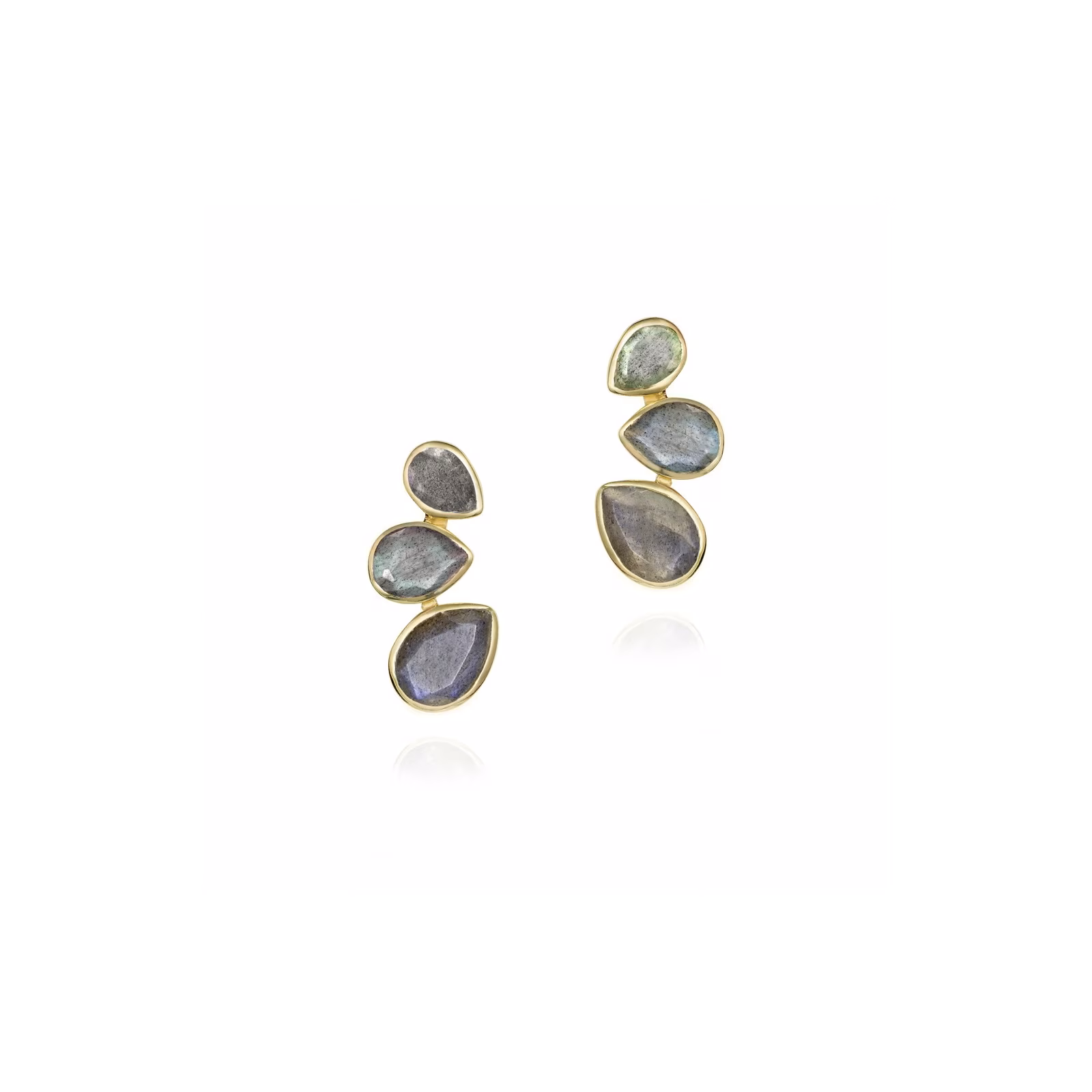 Cada pendiente incorpora tres piedras naturales de Labradorita, engastadas en plata de ley 925 con baño de oro 18K, aportando matices únicos y sofisticación a cada pieza.