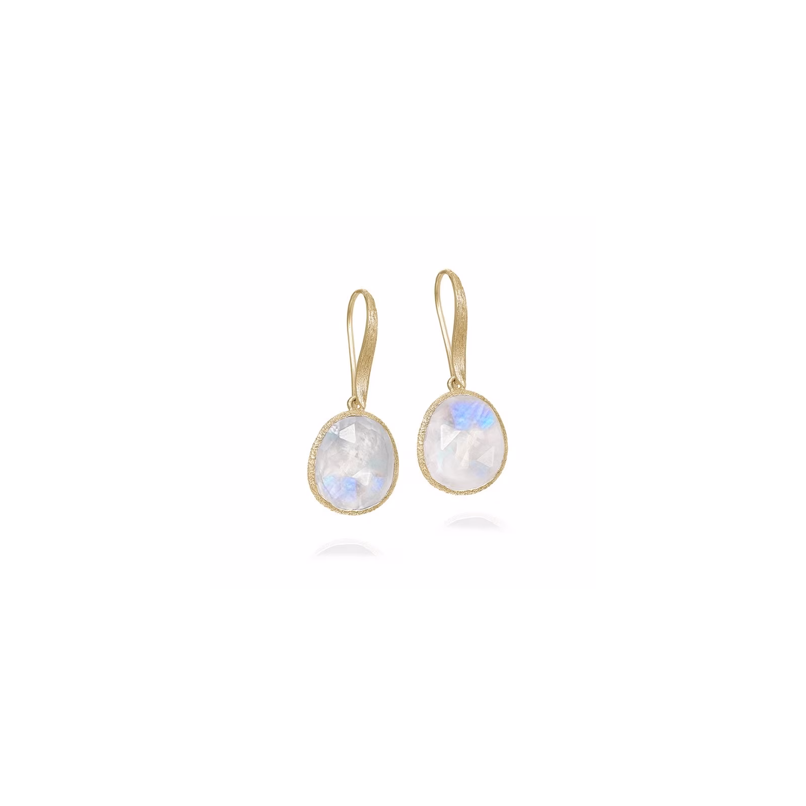 Pendientes colgantes con cierre de gancho de la colección Shade de Jorge Revilla, con piedra natural de espectrolita. Un diseño delicado y lleno de carácter, trabajado en plata de ley 925 con baño de oro de 18 quilates, ideal para quienes buscan una joya con presencia.