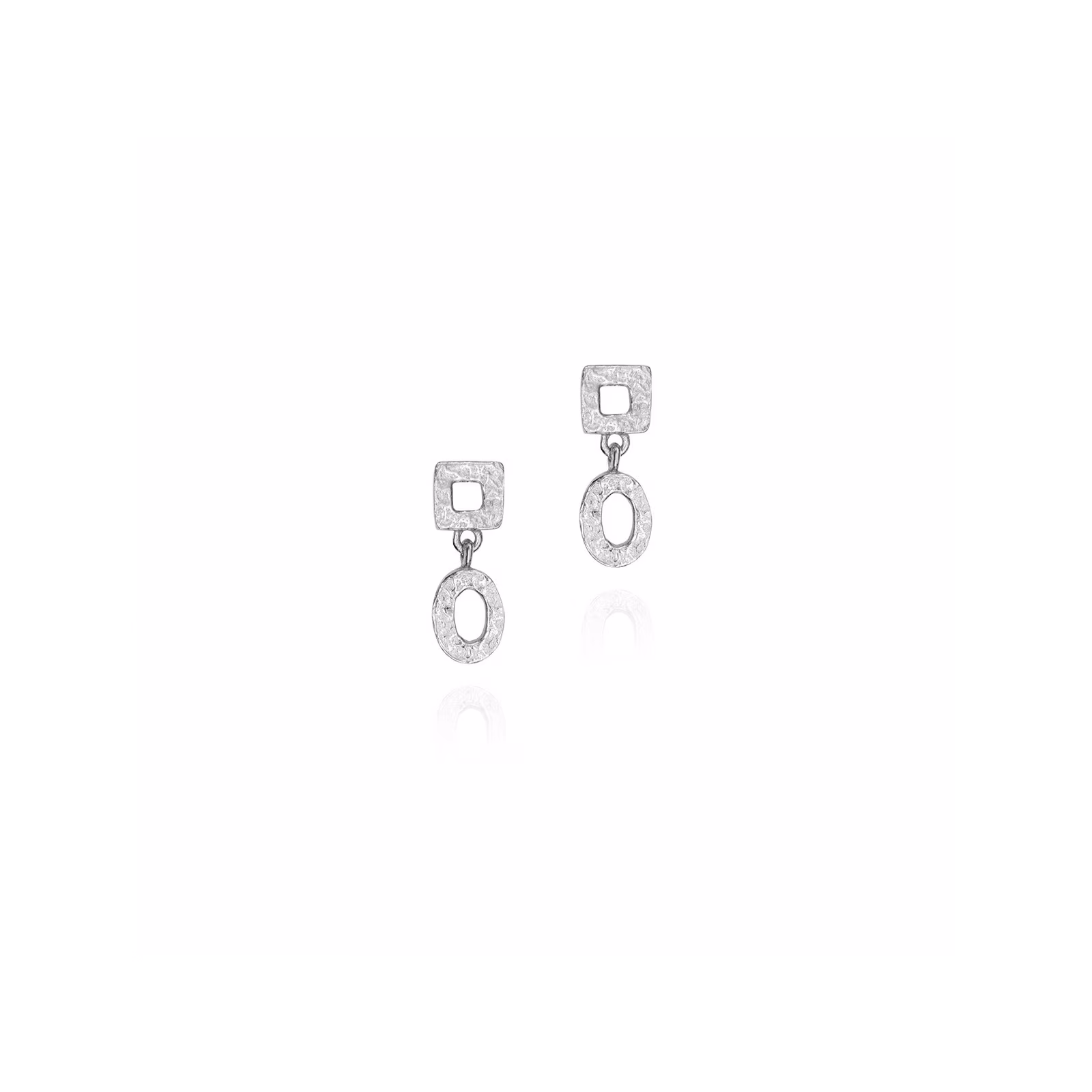 Estos pendientes de presión están fabricados en plata de ley 925 y presentan un diseño minimalista compuesto por un pequeño cuadrado del que cuelga un círculo, creando una silueta moderna y ligera.