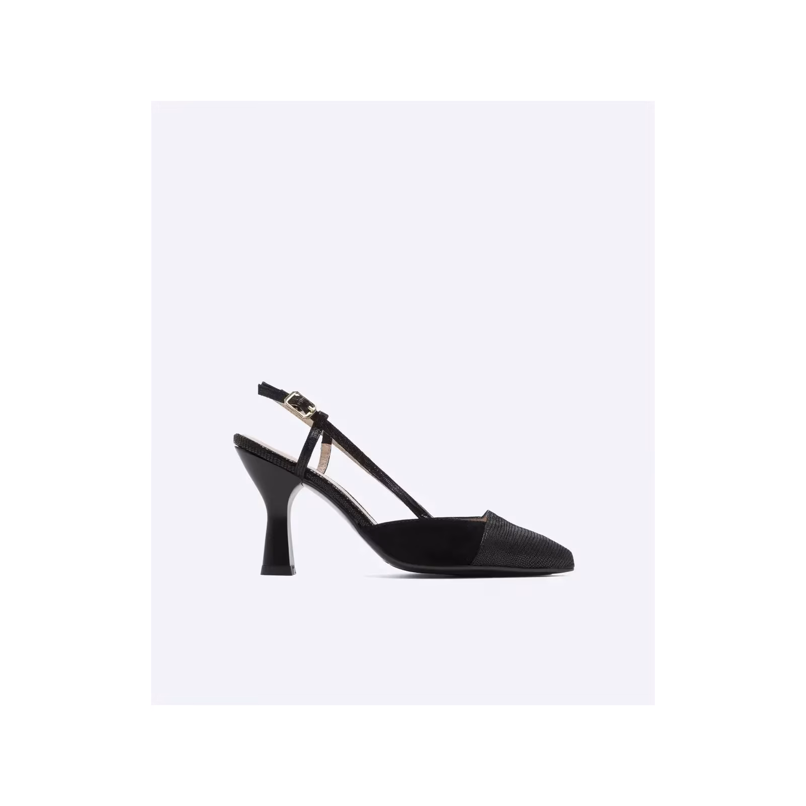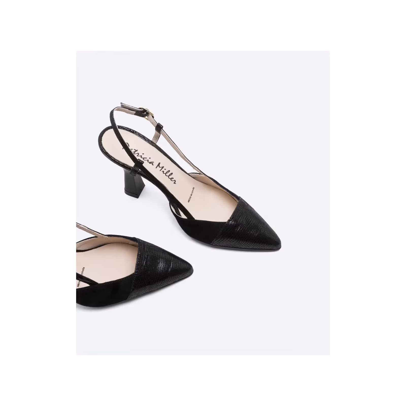 Zapato de salón destalonado modelo Lucca en piel ante color negro combinado con piel grabada al tono.